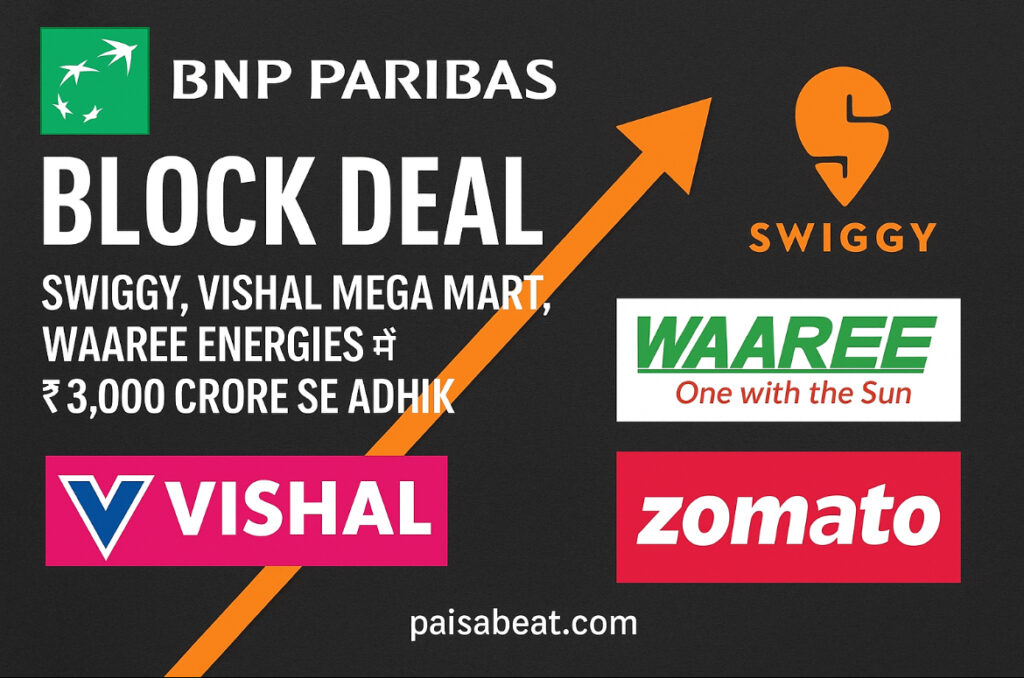 BNP Paribas Financial Markets ने हाल ही में एक बड़े ब्लॉक डील के ज़रिए Swiggy, Vishal Mega Mart, Waaree Energies सहित कई कंपनियों में ₹3,000 करोड़ से अधिक मूल्य की हिस्सेदारी बेची।