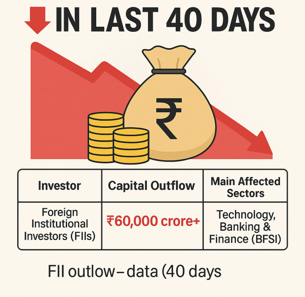 Foreign Institutional Investors (FIIs) have withdrawn ₹60,000+ crore in the last 40 days — major pressure on Technology & BFSI sectors.