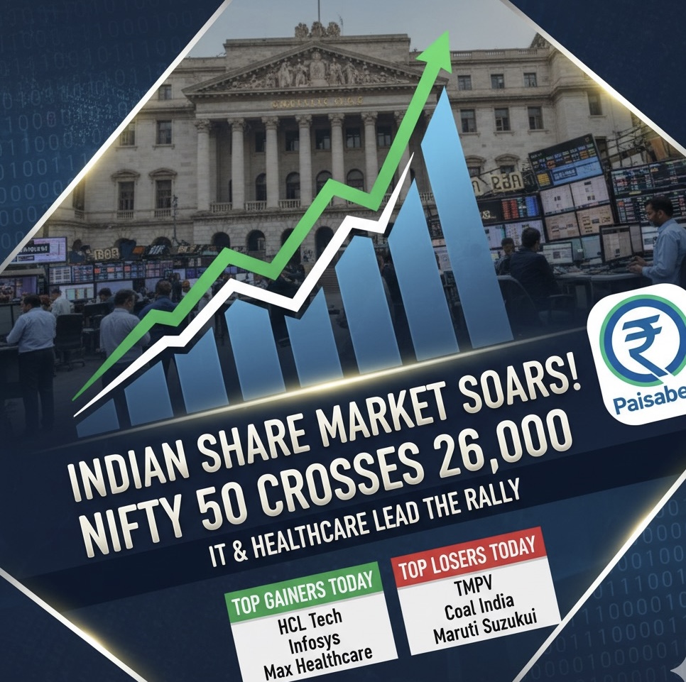 आज शेयर बाजार ने मजबूत वापसी दिखाई। Nifty 50 ने 26,000 के मनोवैज्ञानिक स्तर को पार कर बंद किया जबकि Sensex ने लगभग 500 अंक की तेज बढ़त दिखाई। खासतौर पर IT Shares ने बाजार को मजबूती दी और कई बड़े IT और हेल्थकेयर शेयरों में जबरदस्त खरीदारी देखी गई। इसी के साथ कुछ मिड और large cap स्टॉक्स में selective profit booking भी नजर आई, जिससे बाज़ार में मिश्रित परन्तु सकारात्मक माहौल बना रहा।